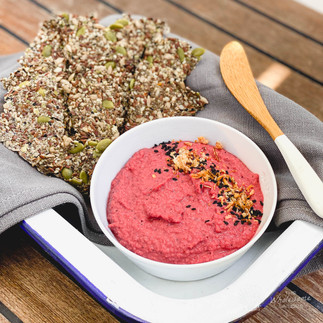 Blitz for 30 seconds or until all ingredients form a smooth paste. You may need to add some beetroot juice to loosen the mixture, try adding two tablespoons at a time until you reach the desired consistency.